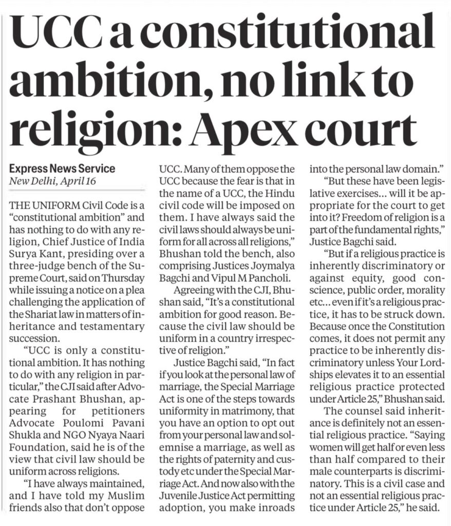 The Supreme Court, while dealing with issues in personal laws, stated that the Uniform Civil Code (UCC) is a “constitutional ambition” and not linked to religion, aiming to ensure uniform civil laws for all citizens.