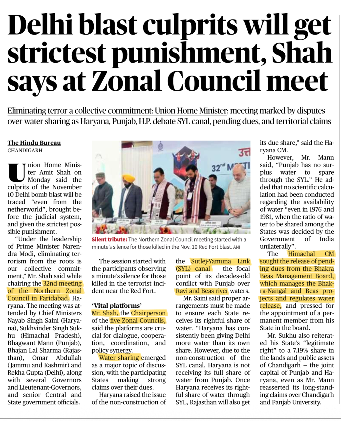 - Issues: SYL canal dispute, Ravi–Beas water, Himachal pending dues, Chandigarh claims.