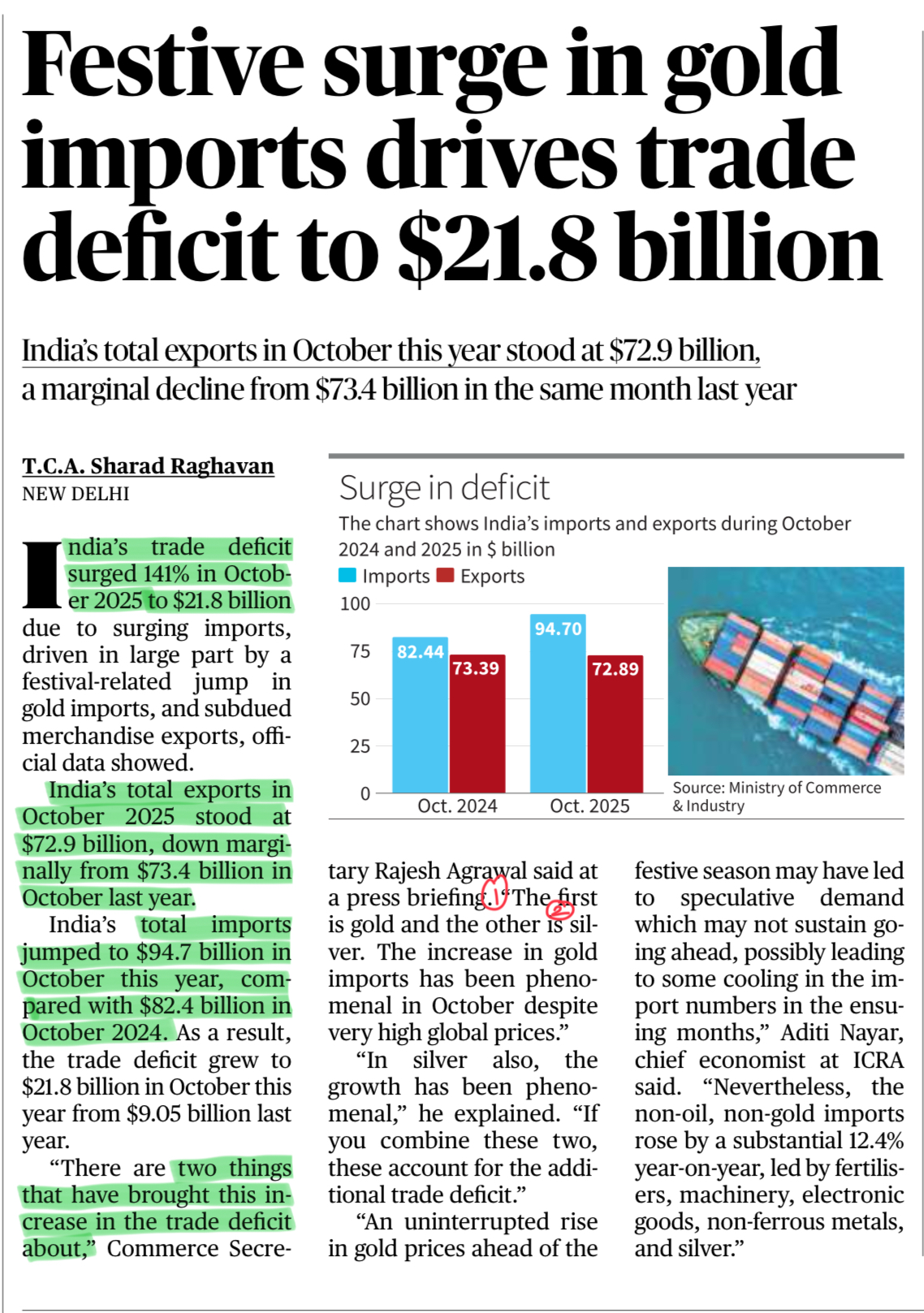 - India’s trade deficit surged 141% to $21.8 billion in October 2025.