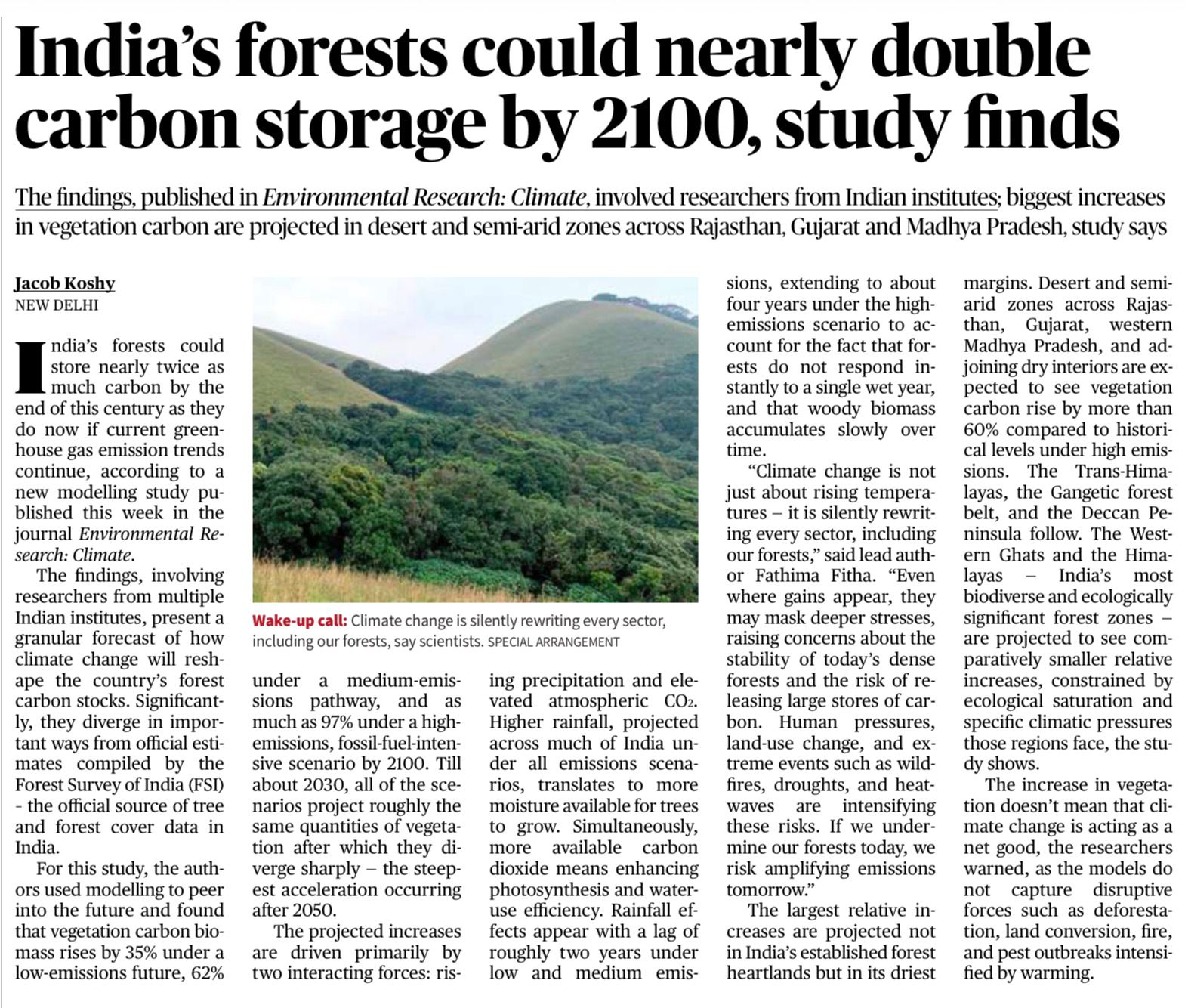 A study published in Environmental Research: Climate finds that India’s forests may nearly double their carbon storage by 2100 due to rising CO₂ levels and increased rainfall, but raises concerns about ecosystem stress and instability.