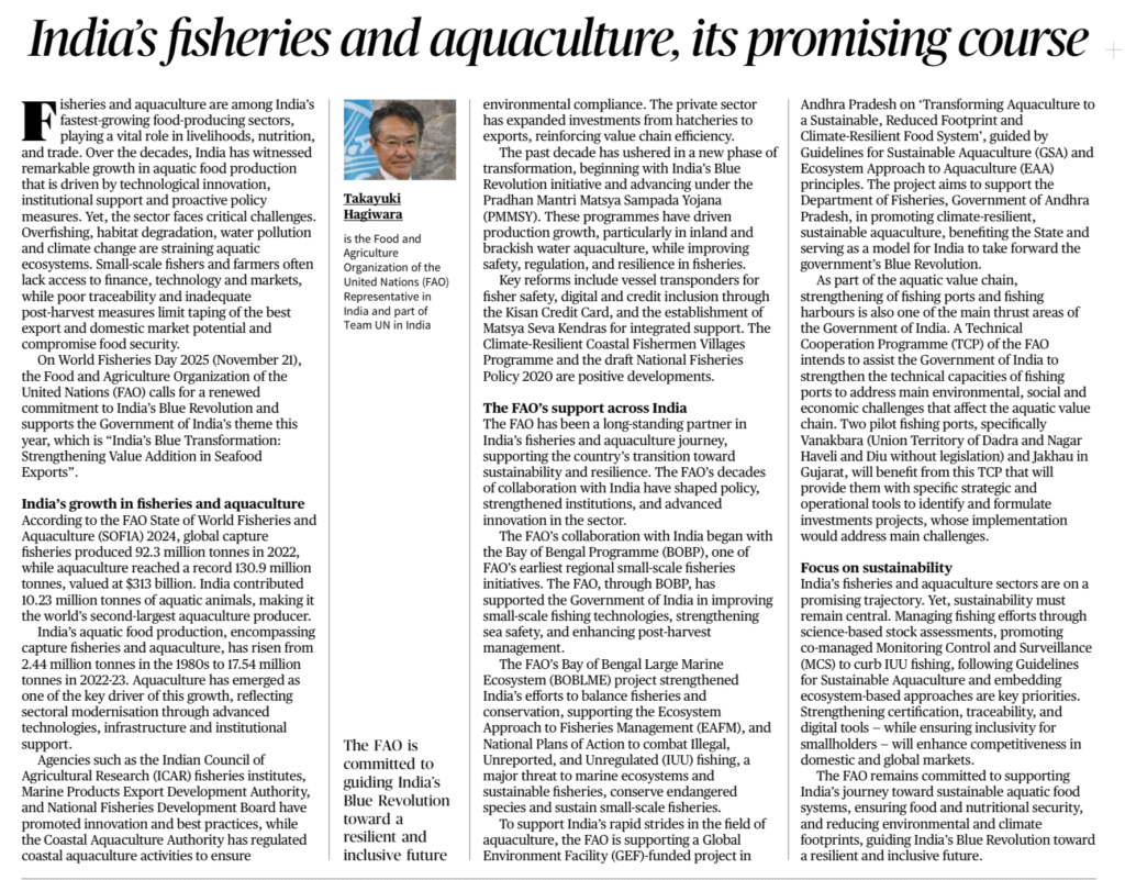 • Indian aquaculture growth: 2.24 million tonnes (1980s) → 17.4 million tonnes (2022-23)
