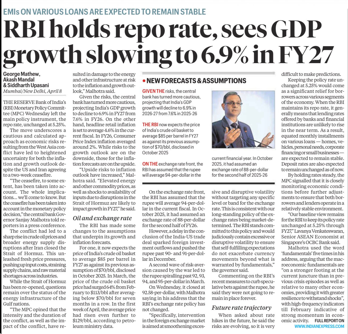 The RBI Monetary Policy Committee (MPC) kept the repo rate unchanged at 5.25%, while revising GDP growth for FY27 to 6.9%, reflecting a cautious stance amid global uncertainties.