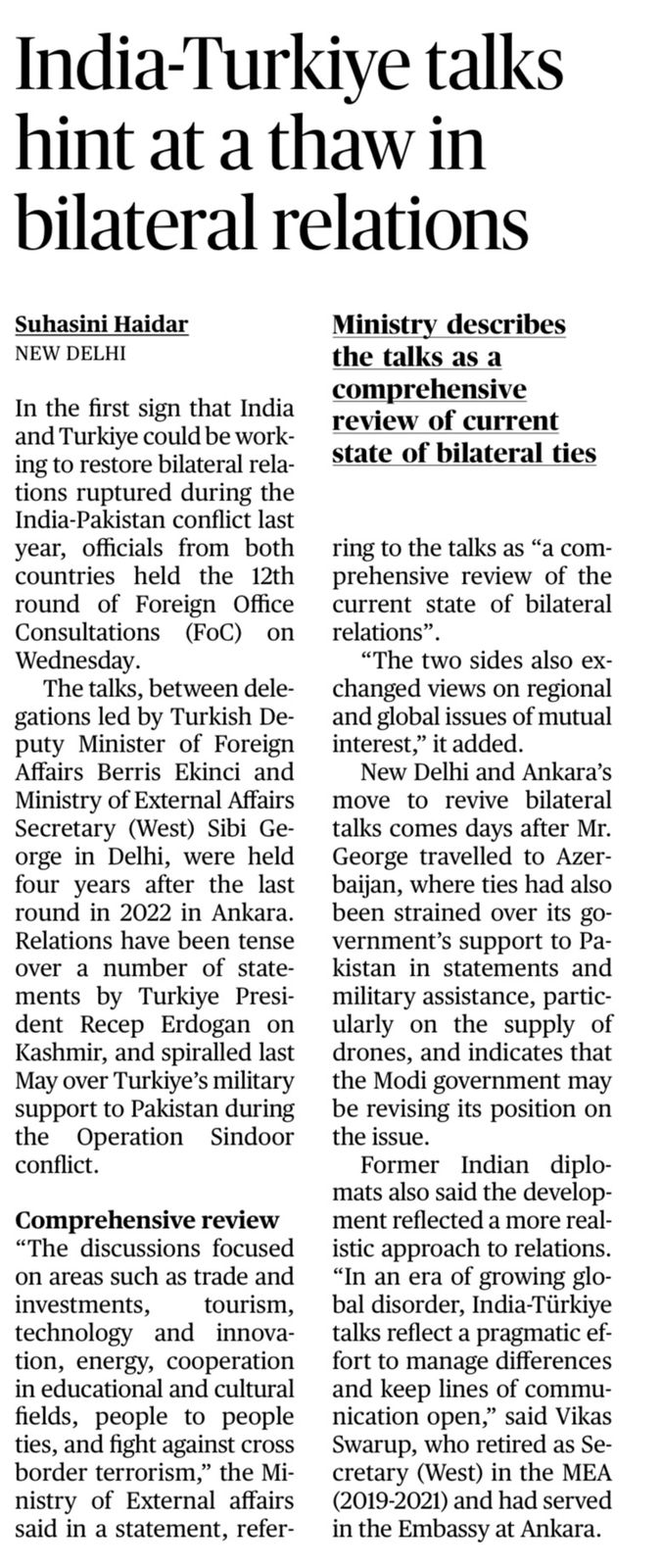 India and Türkiye held the 12th round of Foreign Office Consultations (FoC: structured diplomatic dialogue between foreign ministries) after ~4 years, signalling a possible reset in strained bilateral ties.