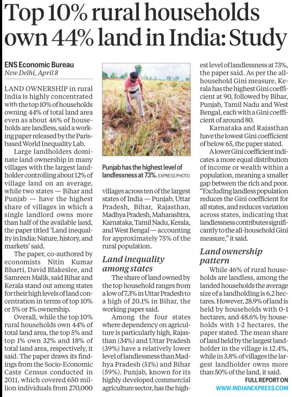 World Inequality Lab study, based on Socio-Economic and Caste Census (SECC), 2011, shows high land inequality in rural India.