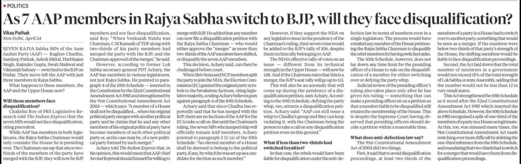 Seven AAP MPs in the Rajya Sabha joined the BJP. The key issue is whether this attracts disqualification under the anti-defection law.