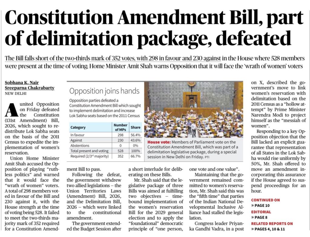 • Outcome: 131st Amendment Bill failed (no special majority) → Delimitation Bill withdrawn