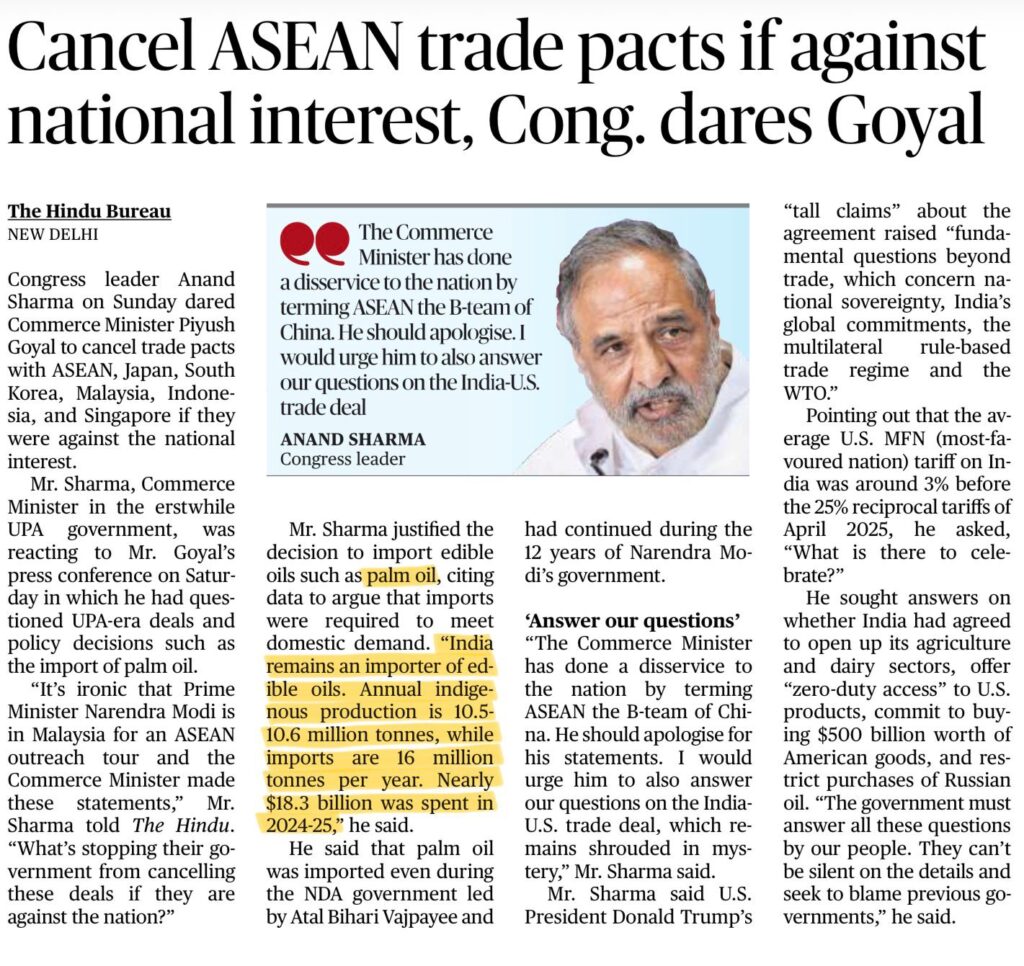 Congress challenged the Commerce Minister to cancel ASEAN trade agreements if they are against national interest, amid concerns over India’s edible oil imports and trade imbalance.