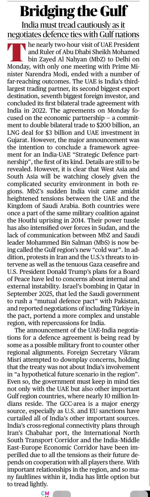 The article analyses India’s move to deepen defence cooperation with Gulf countries—especially the UAE—while cautioning against regional rivalries, instability, and the need to balance India’s strategic, energy, and diaspora interests.