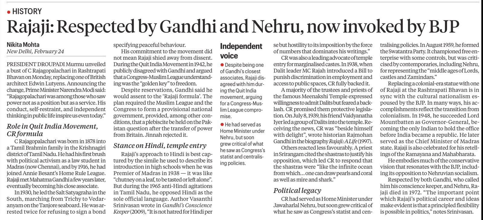 A statue of C. Rajagopalachari (Rajaji) has been installed at Rashtrapati Bhavan, replacing Edwin Lutyens’ statue. (Page 4)