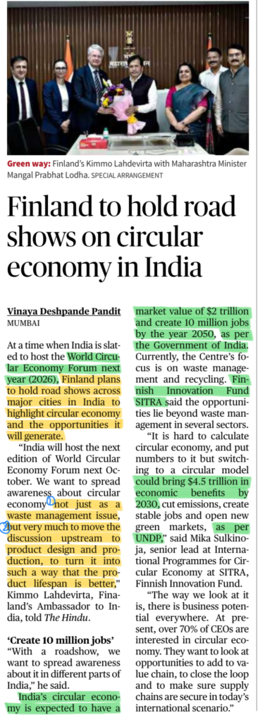 • Finland to hold roadshows across major Indian cities to promote circular economy and explore collaborations.