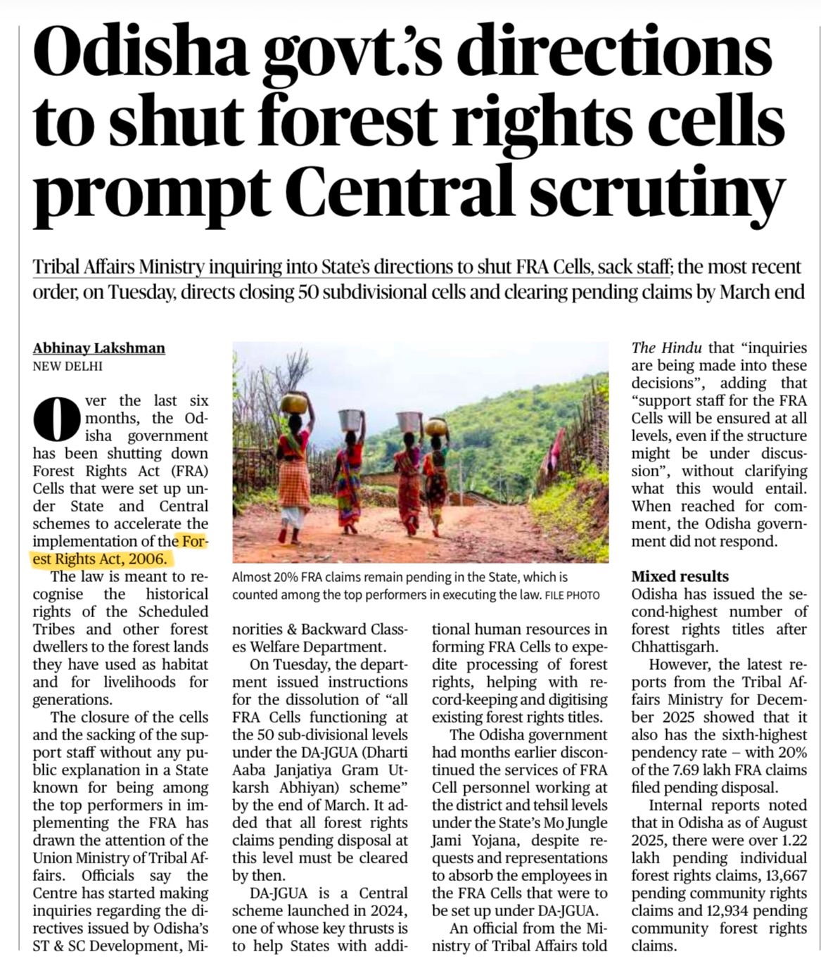 Odisha government has been shutting down Forest Rights Act (FRA) Cells and removing support staff over the past six months. Union Ministry of Tribal Affairs has sought explanation and directed clearance of pending FRA claims by March-end.