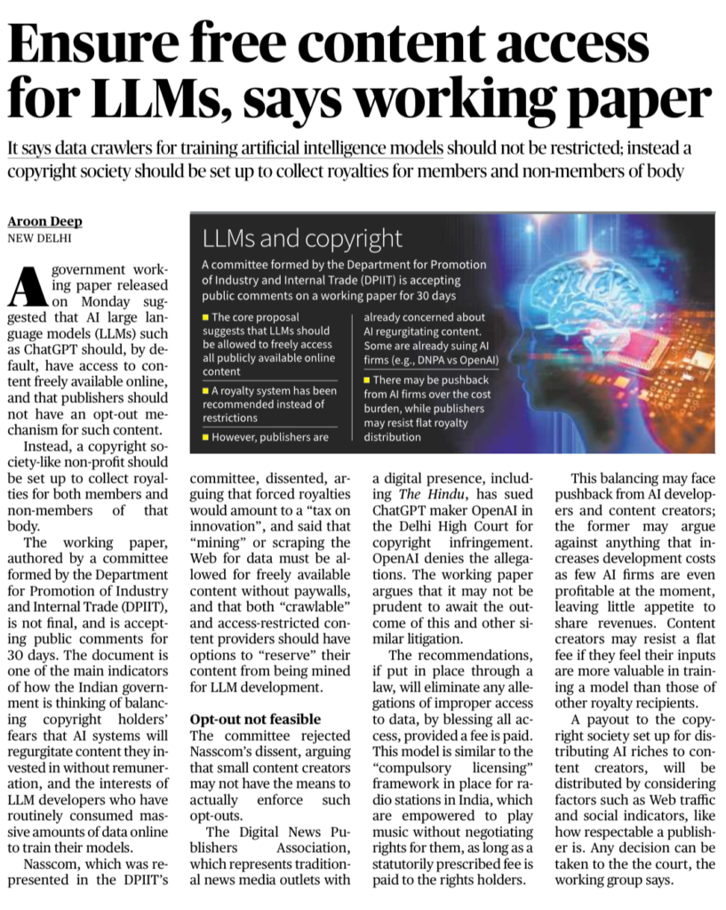 LLMs should be allowed to train on all publicly available internet data so India’s  AI models get enough training material.