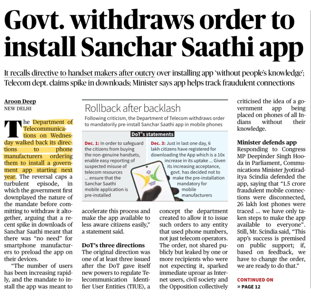 Govt Withdraws Order on Sanchar Saathi App | Sanchar Saathi App UPSC Current Affairs