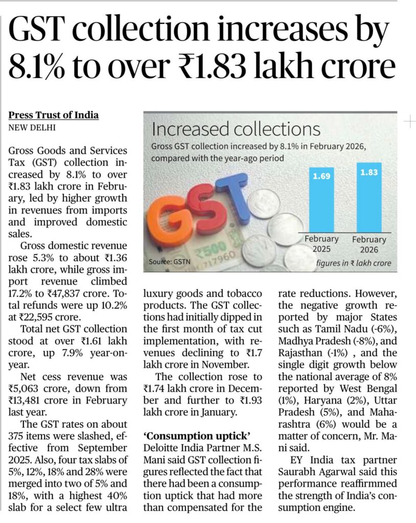 Gross GST collections rose 8.1% YoY in Feb 2026 to ₹1.83 lakh crore.