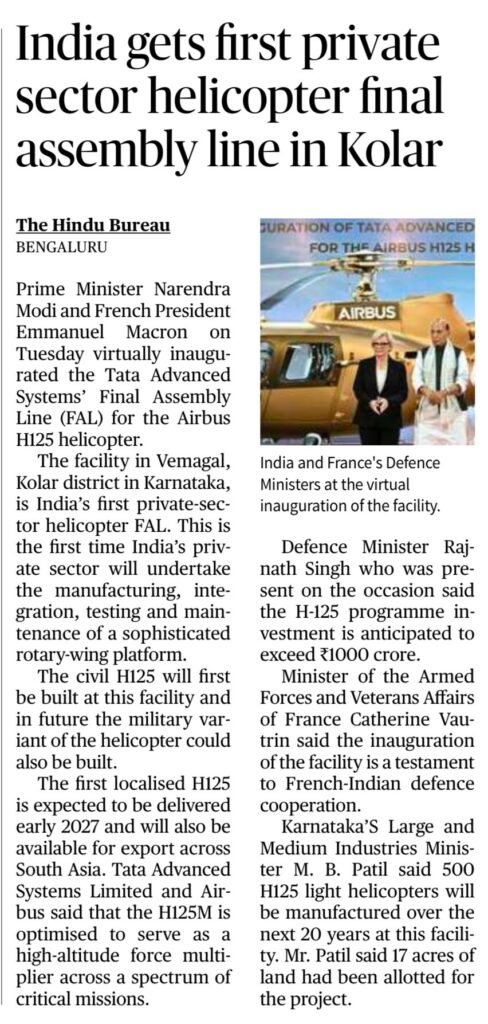 India and France inaugurated India’s first private-sector helicopter Final Assembly Line (FAL) at Vemagal, Kolar (Karnataka). Built by Tata Advanced Systems Ltd (TASL) with Airbus for Airbus H125.