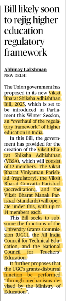 The Union government plans to introduce the Viksit Bharat Shiksha Adhishthan Bill, 2025 to restructure and centralise the regulation of higher education by replacing existing statutory bodies with a new umbrella framework.