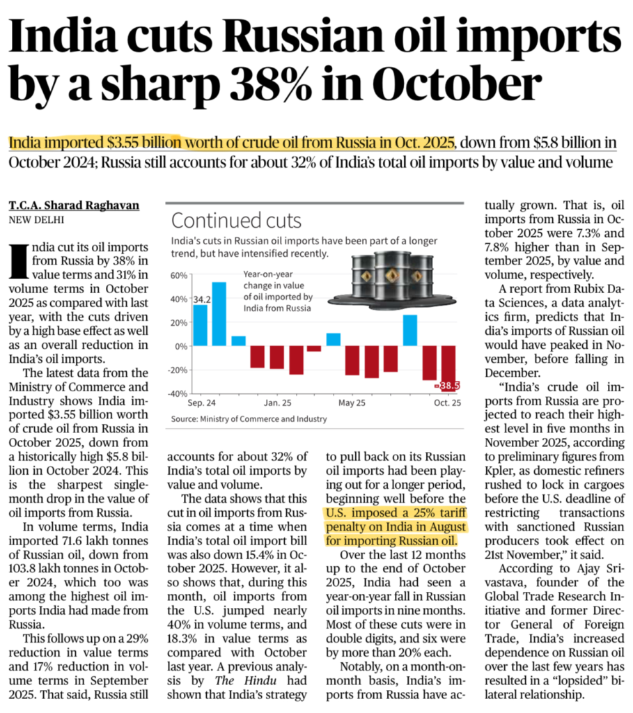 1. India’s Russian oil imports in Oct 2025: $3.55 billion (↓ 38% YoY).
