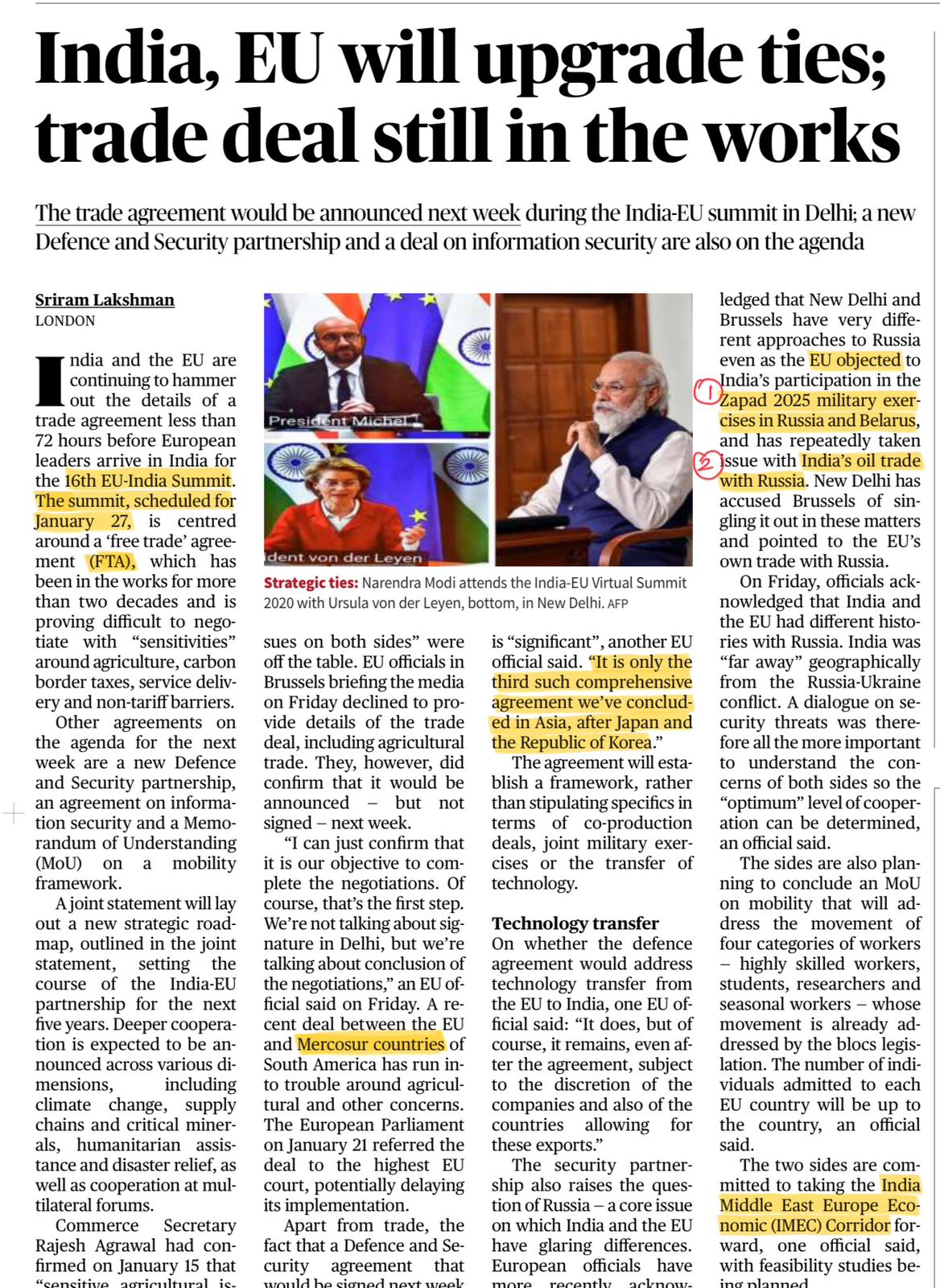 India and the European Union are set to upgrade their strategic partnership during the India-EU Summit, while negotiations on a long-pending Free Trade Agreement (FTA) continue.