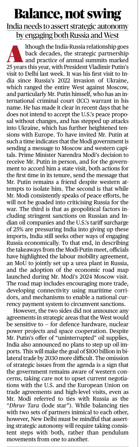 1. Putin’s visit signals continuity in India–Russia ties despite Western efforts to isolate Moscow after the Ukraine war.