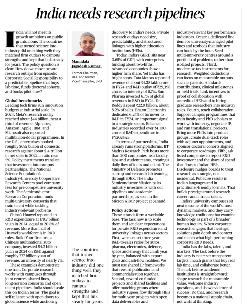 India must build predictable, long-term R&D pipelines rather than episodic or CSR-based funding. Private R&D investment needs scale, continuity, structured industry–academia linkages, and measurable outcomes.