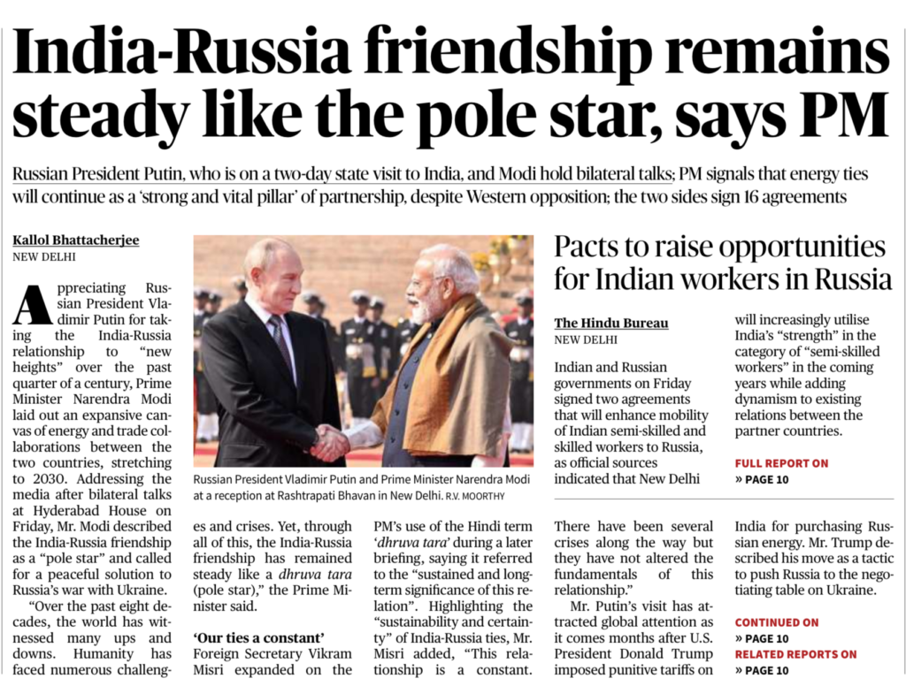 “In light of the recent India–Russia summit, critically examine how the bilateral partnership is expanding beyond a traditional defence focus into broader strategic, economic, and people-centric domains.”