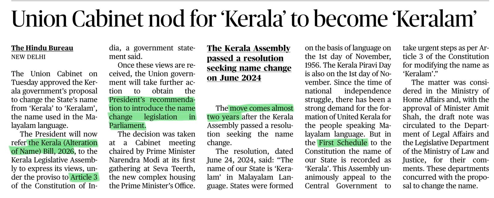 The Union Cabinet approved the Kerala government’s proposal to rename the State from “Kerala” to “Keralam”, reflecting the Malayalam pronunciation. (Page 2)