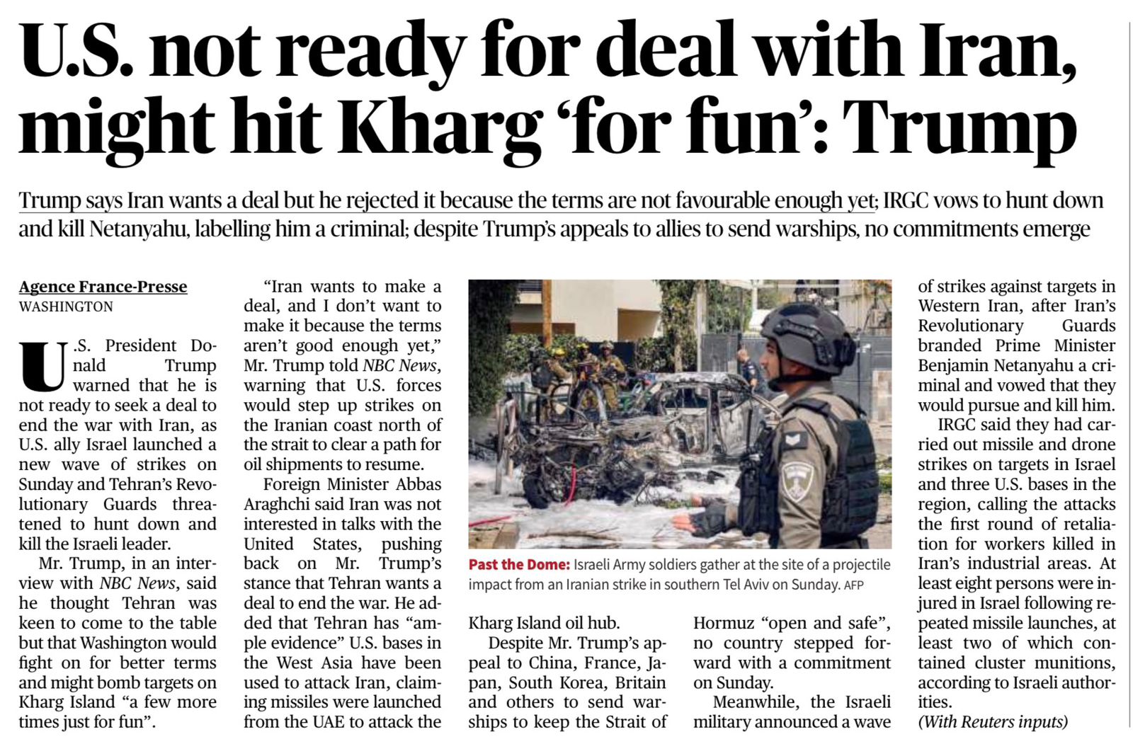 The news highlights rising U.S.–Iran tensions, with remarks by Donald Trump warning of possible strikes on Iran’s Kharg Island amid ongoing conflict dynamics in West Asia.
