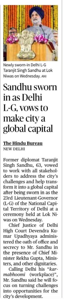 Taranjit Singh Sandhu was sworn in as the Lieutenant Governor (L-G) of the National Capital Territory of Delhi.