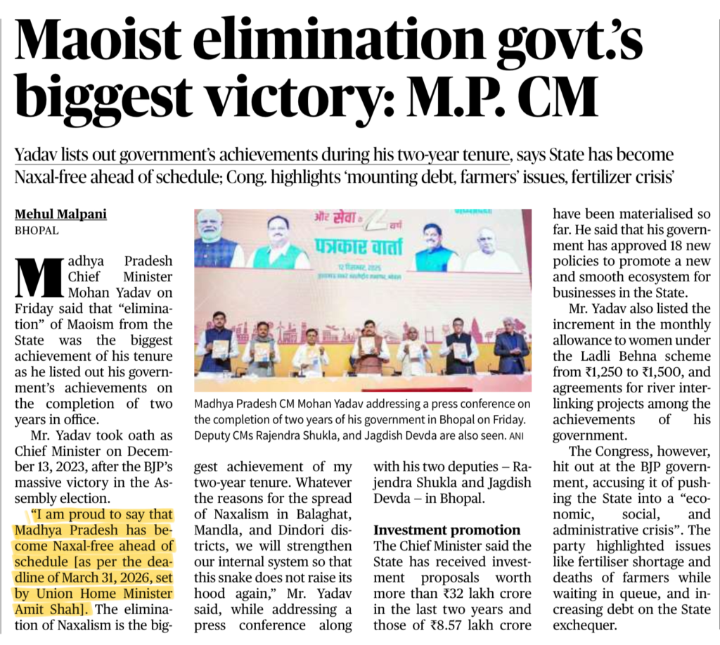 Madhya Pradesh CM Mohan Yadav stated that the elimination of Maoism is his government’s biggest achievement, claiming the State has become Naxal-free ahead of the March 2026 national deadline set by the Union government.