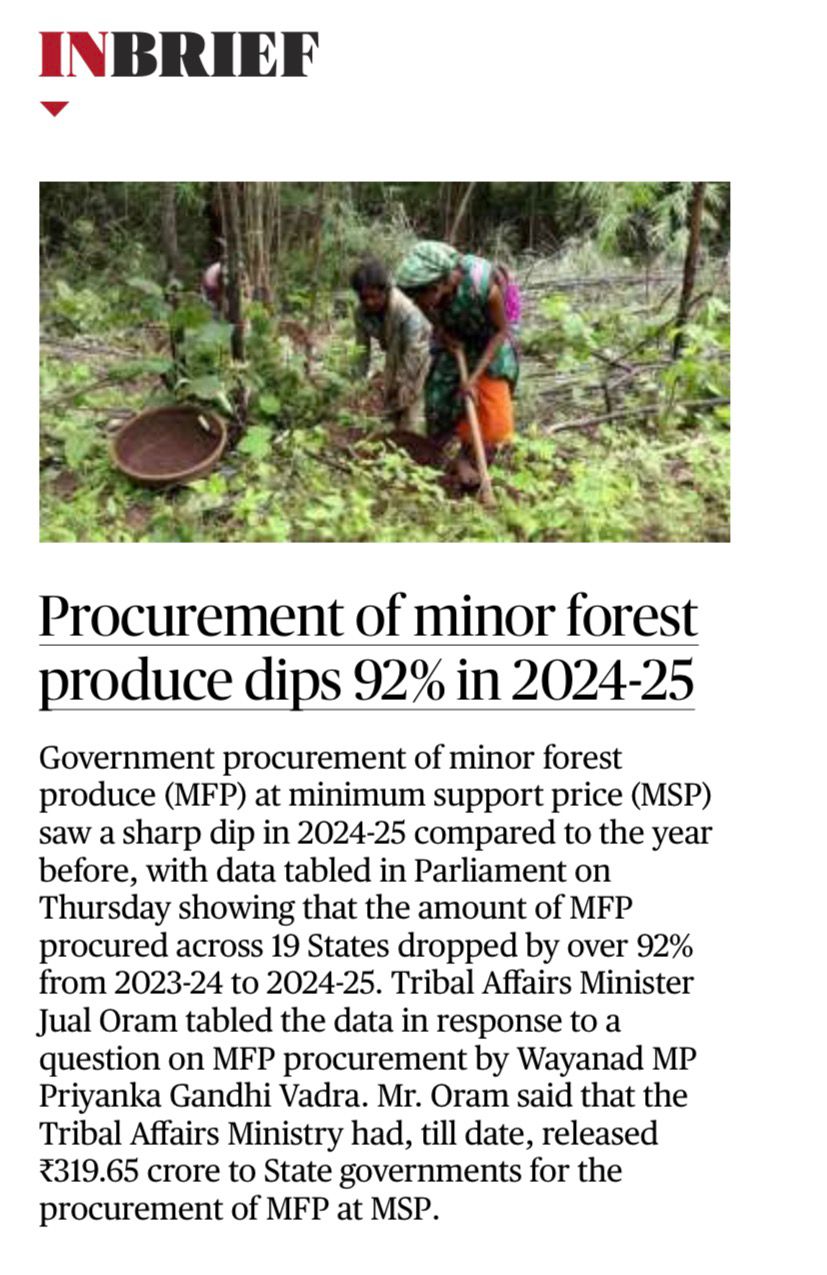 • Government data shows a 92% drop in procurement of Minor Forest Produce (MFP) at MSP across 19 States in 2024–25 compared to 2023–24.