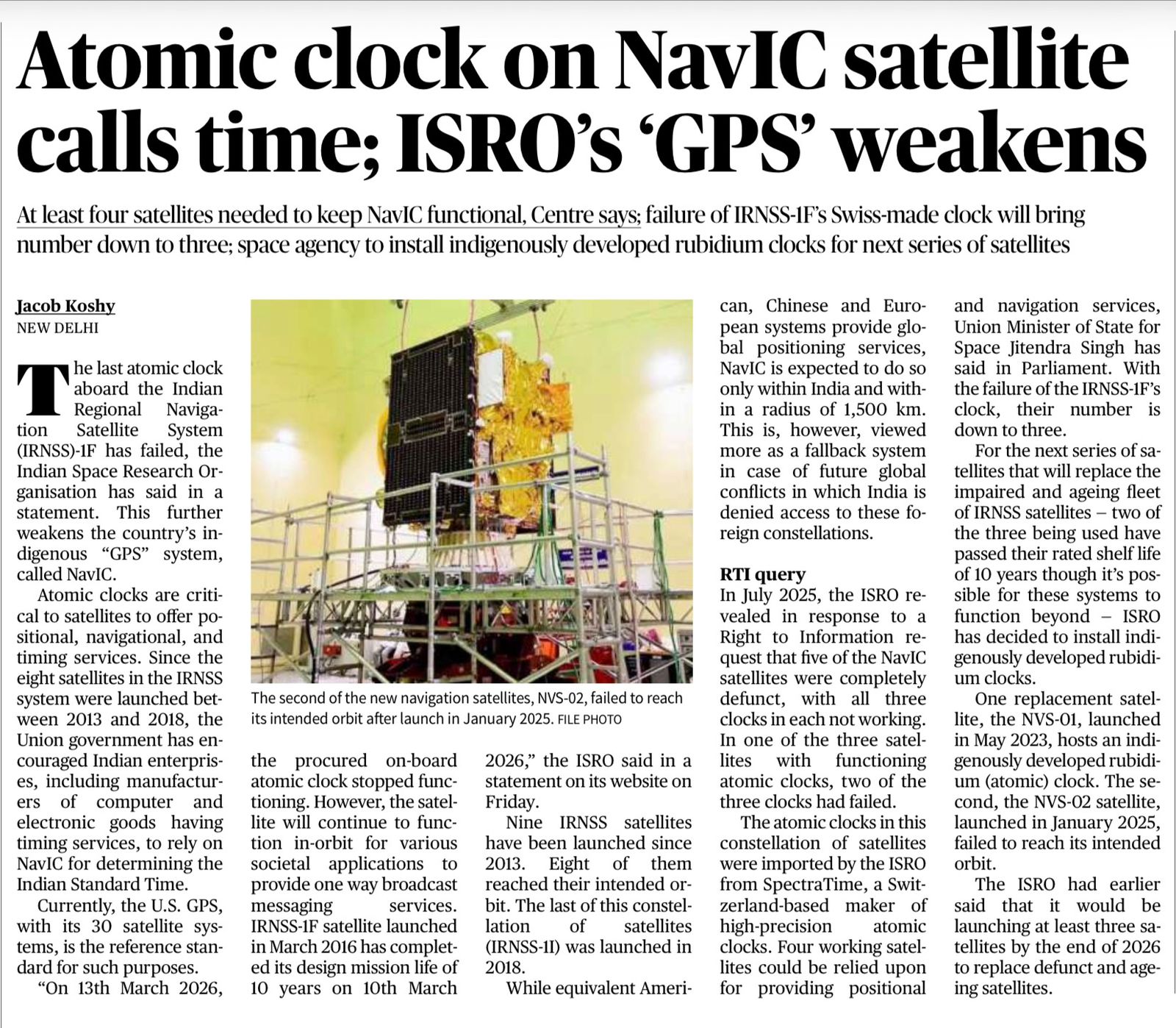Failure of an atomic clock on an IRNSS (NavIC) satellite has weakened India’s regional navigation capability; the Indian Space Research Organisation (ISRO) plans indigenous replacements for future satellites.