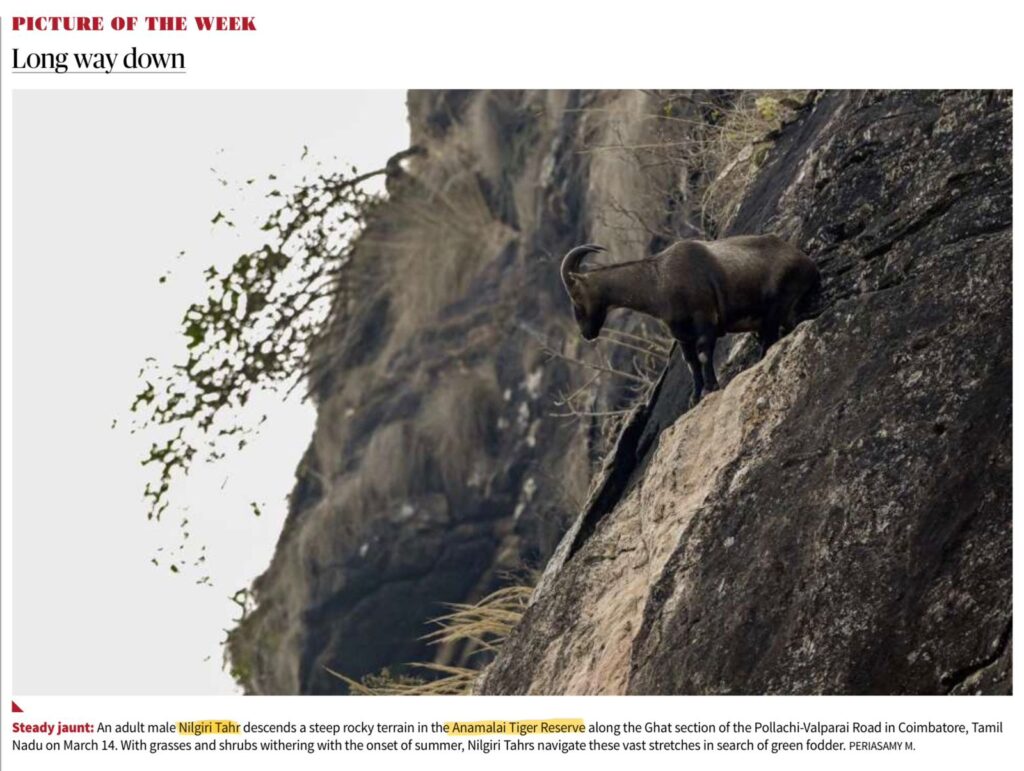 Nilgiri Tahr, an endemic species of the Western Ghats, is often in news due to conservation concerns, habitat fragmentation, and climate-induced stress on high-altitude grasslands. Protected areas like Anamalai Tiger Reserve play a key role in its survival.
