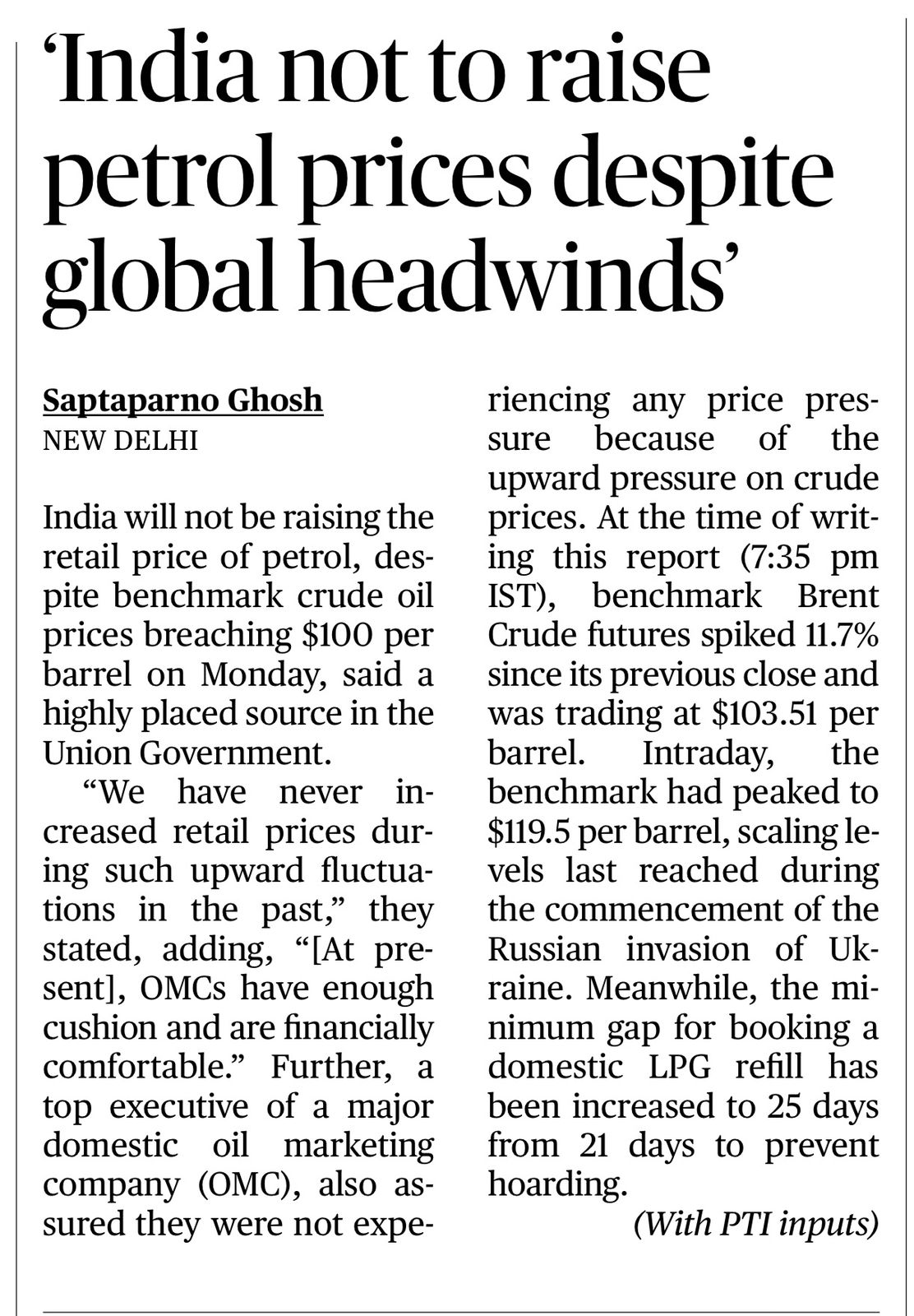 The government indicated petrol prices will not rise immediately despite crude crossing $100 per barrel, as oil companies and tax adjustments can absorb shocks.