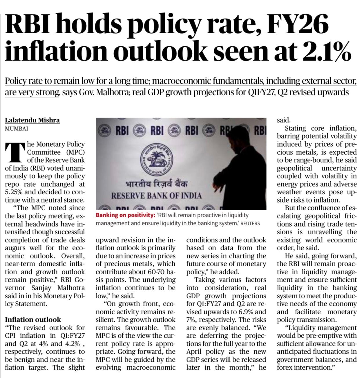 • Inflation projection for FY26: 2.1%.