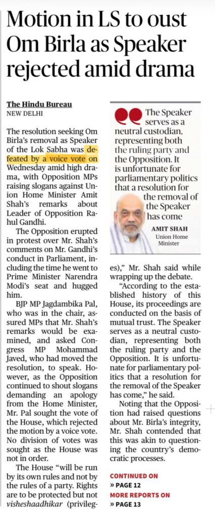 A resolution seeking the removal of Lok Sabha Speaker Om Birla was introduced but was defeated by voice vote.