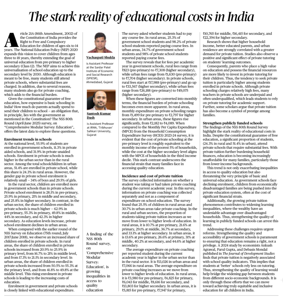 India constitutionally guarantees free and compulsory education (6–14 years) under Article 21A, and NEP 2020 aims for universal schooling up to secondary. Yet, NSS 80th Round (2022–23) shows households facing high and rising educational expenditure, driven mainly by private schools and private coaching, weakening the equity goals of public education.