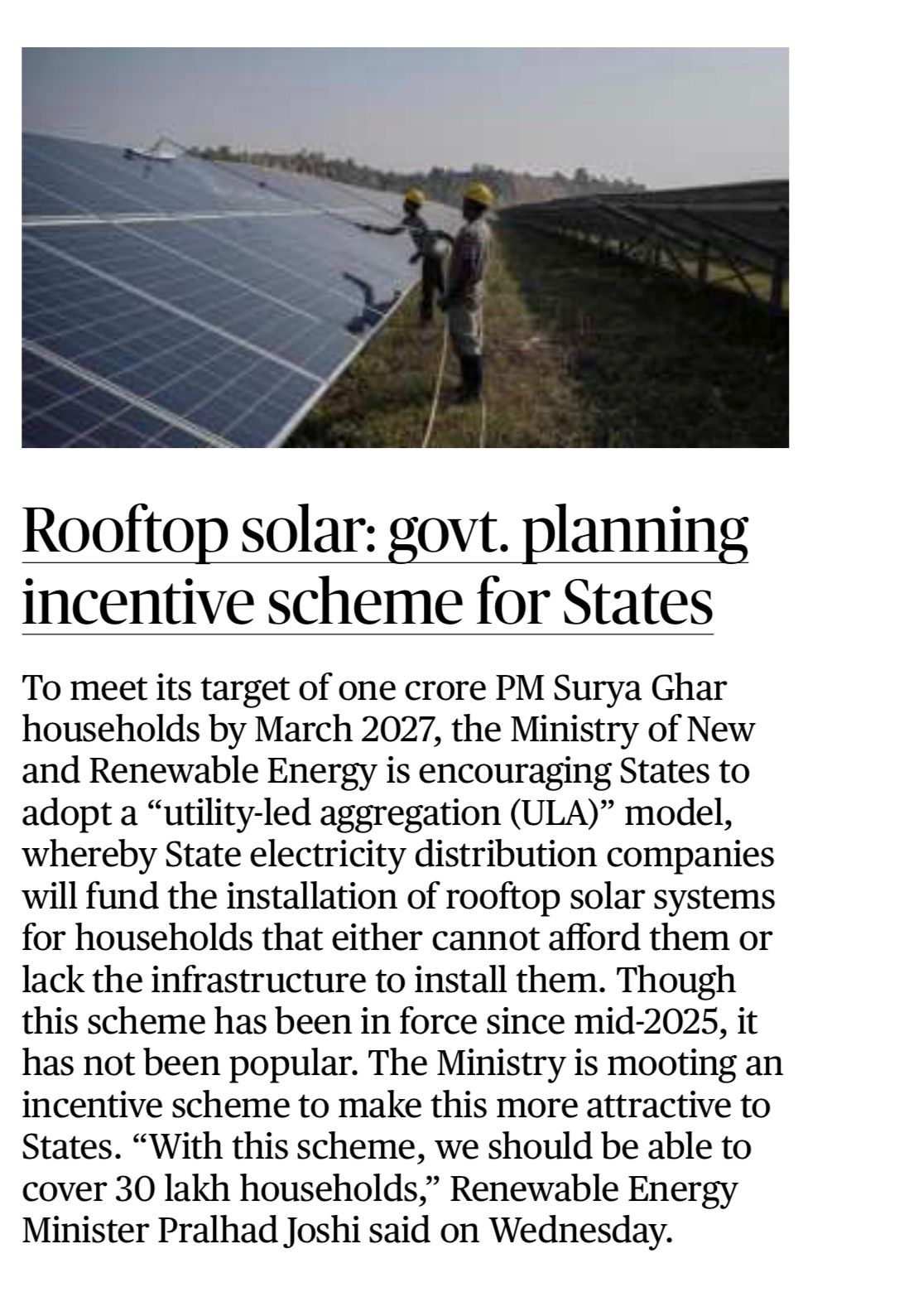 To meet the target of 1 crore households under PM Surya Ghar by March 2027, the government is planning incentives for States to promote the Utility-Led Aggregation (ULA) model, which has seen low adoption.