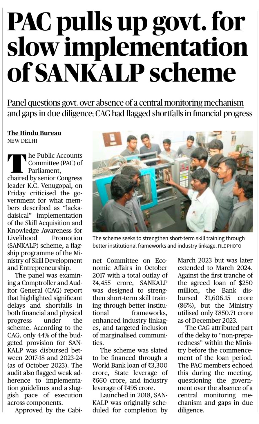 PAC (Public Accounts Committee) has criticised the government for slow and poor implementation of the SANKALP scheme after examining a CAG report showing delays, weak monitoring, and under-utilisation of funds.