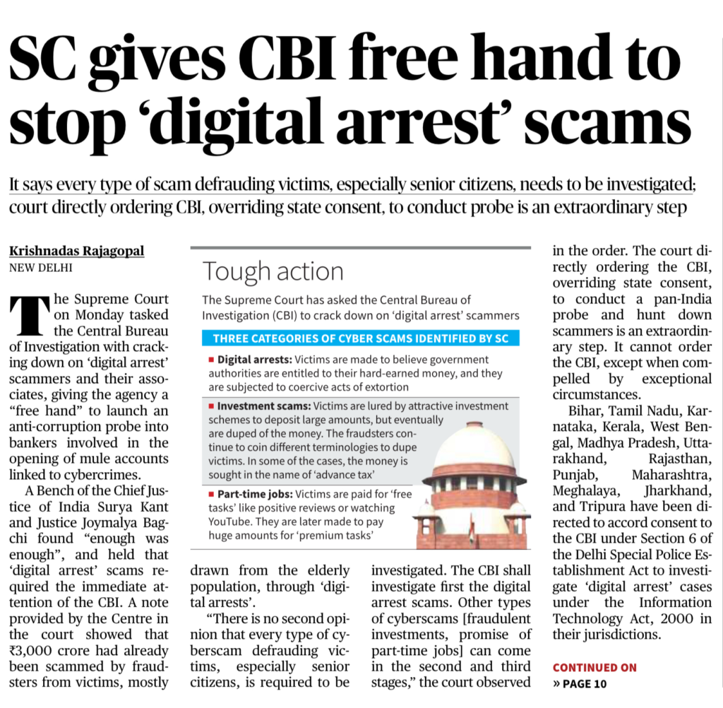 • SC ordered CBI to conduct a pan-India probe into rising digital arrest scams.