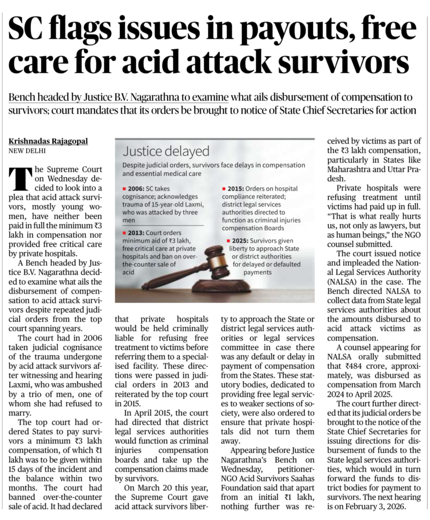The Supreme Court noted that acid attack survivors are still not receiving the mandatory ₹3 lakh compensation or free critical care at private hospitals, despite repeated SC orders (2006, 2013, 2015).