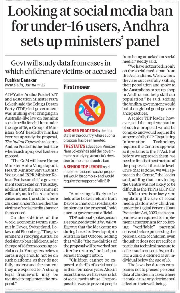 • Andhra Pradesh becomes the first Indian state to formally explore a social media ban for under-16s.
