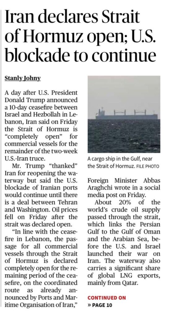 Amid a temporary ceasefire between Israel and Hezbollah (Lebanon) announced by the U.S., Iran declared the Strait of Hormuz open for commercial shipping, while the United States stated that its blockade of Iranian ports will continue until a broader agreement is reached.
